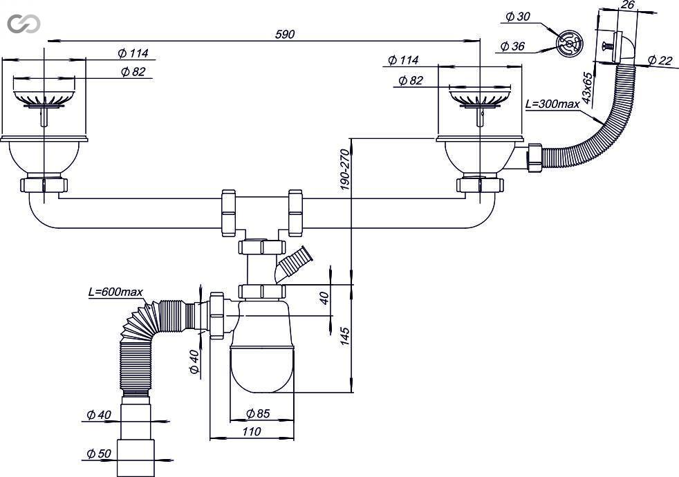 Дополнительно | две пробки-сетки с контейнерами для мусора, перелив, штуцер для подключения стиральной или посудомоечной машины |
